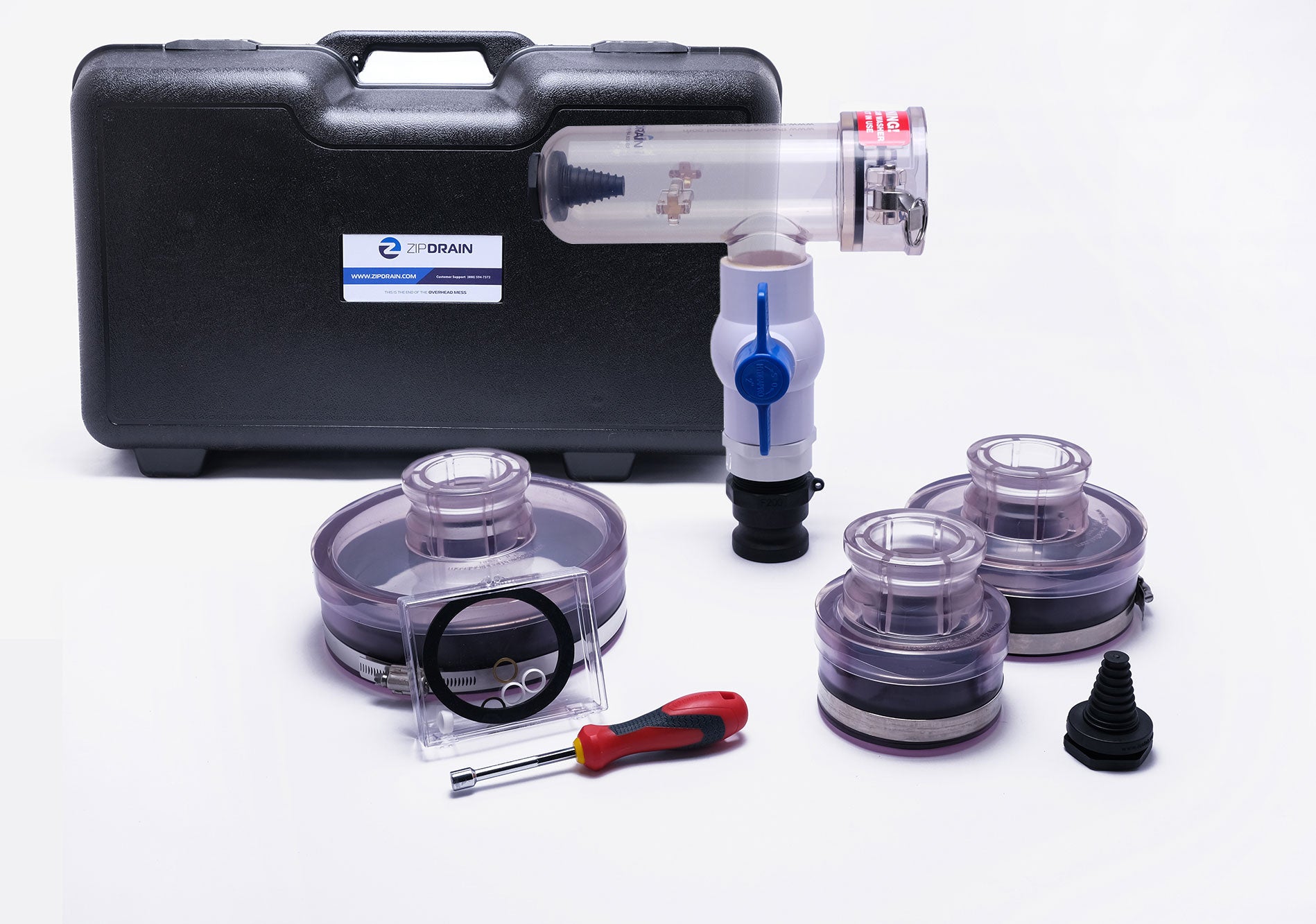Includes Universal Body with Ball Valve, 3" Head, 4" Head, 6" Head, Hi-Torque Clamps (3), (1) Jetter Grommet, Adjustable Safety Strap, 5/16 Nut Driver, 2" Discharge Hose, 2" Return Hose, Case with Handle, Camlock Washer (2), Instructional Materials
